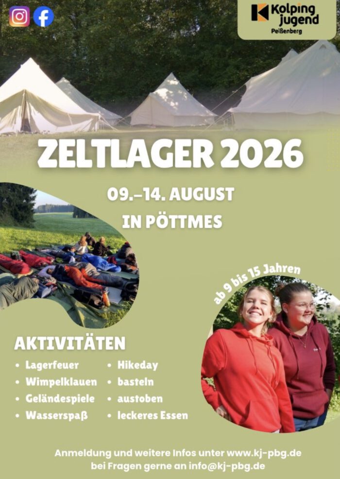 Auch dieses Jahr begeben wir uns gemeinsam mit Euch Kindern von 9 bis 15 Jahren in ein abenteuerliches Zeltlager. Gemeinsam werden wir eine unvergessliche Zeit erleben mit vielen verschiedenen Aktivitäten. Euch erwarten coole Geländespiele, Wasserspaß, aufregende Abende am Lagerfeuer mit Wimpelklauern, Bastelaktionen, schlafen in Zelten und noch vieles mehr. Das Zeltlager findet vom 9. bis zum 14. August im Pöttmes statt, wo wir gemeinsam mit dem Bus hinfahren werden. Wir freuen uns auf viele Kinder 🙂